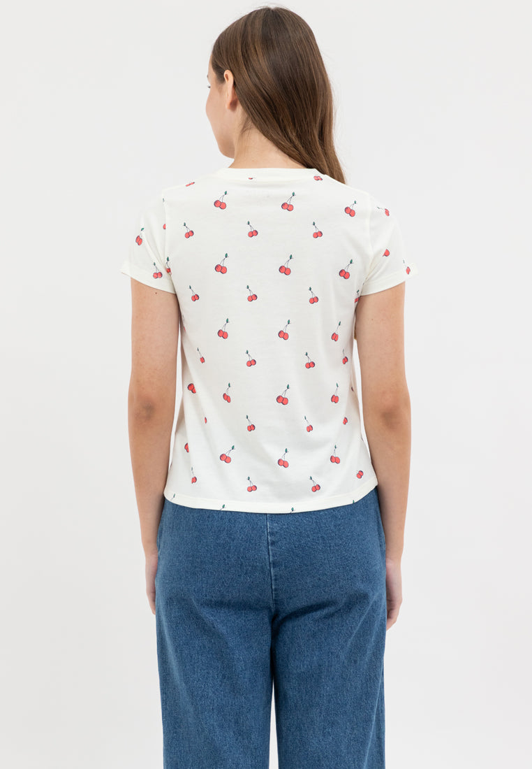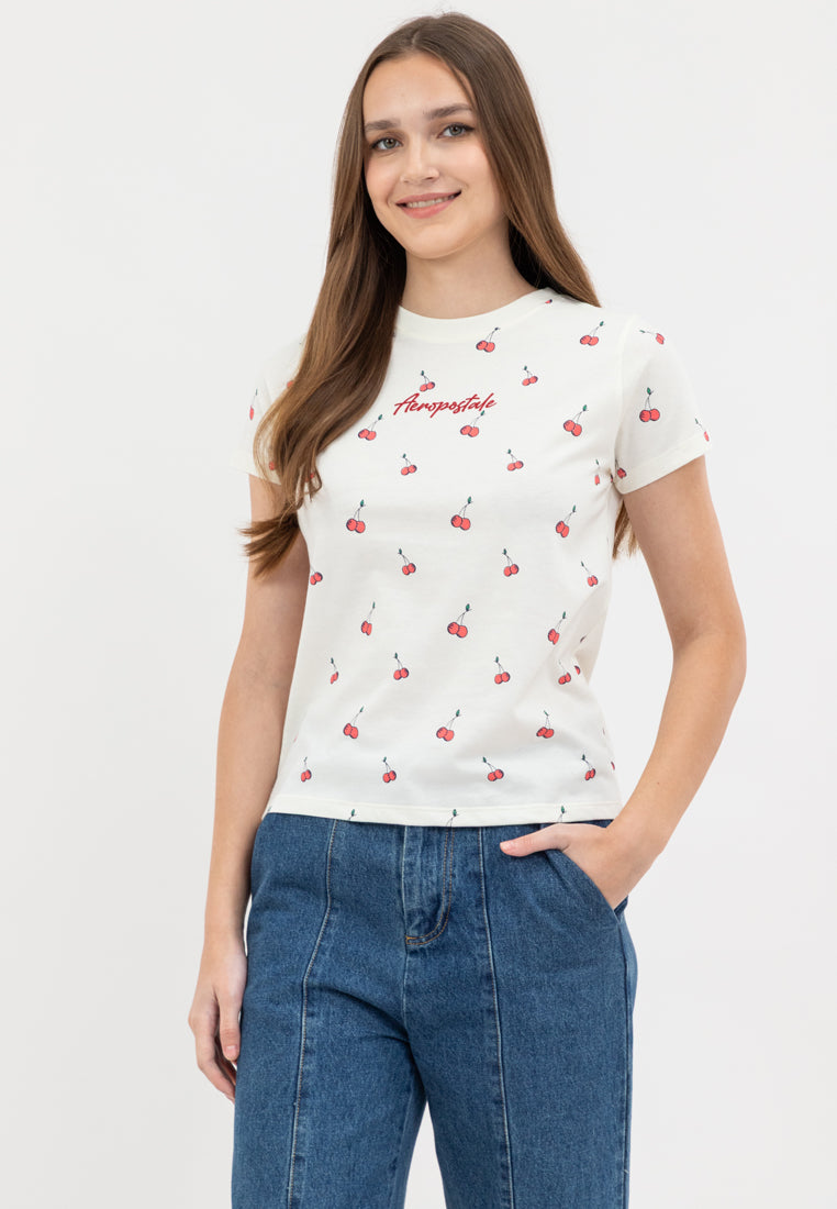 Expand your wardrobe rotation with Aeropostale's Ladies Comfort fit Graphic Tee, featuring an all-over cherry repeat print motif, finished with a branding script across the chest for added appeal.