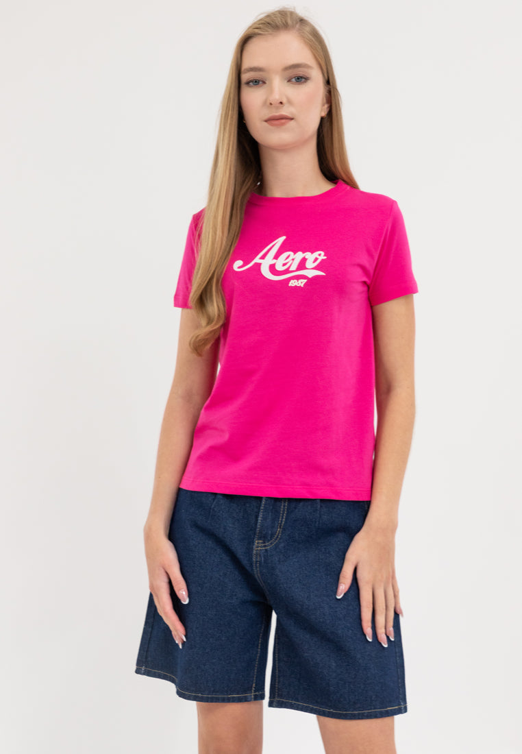 Expand your wardrobe rotation with Aeropostale's Ladies Applique Logo Graphic Tee, featuring a retro-inspired branding applique across the chest for added appeal.